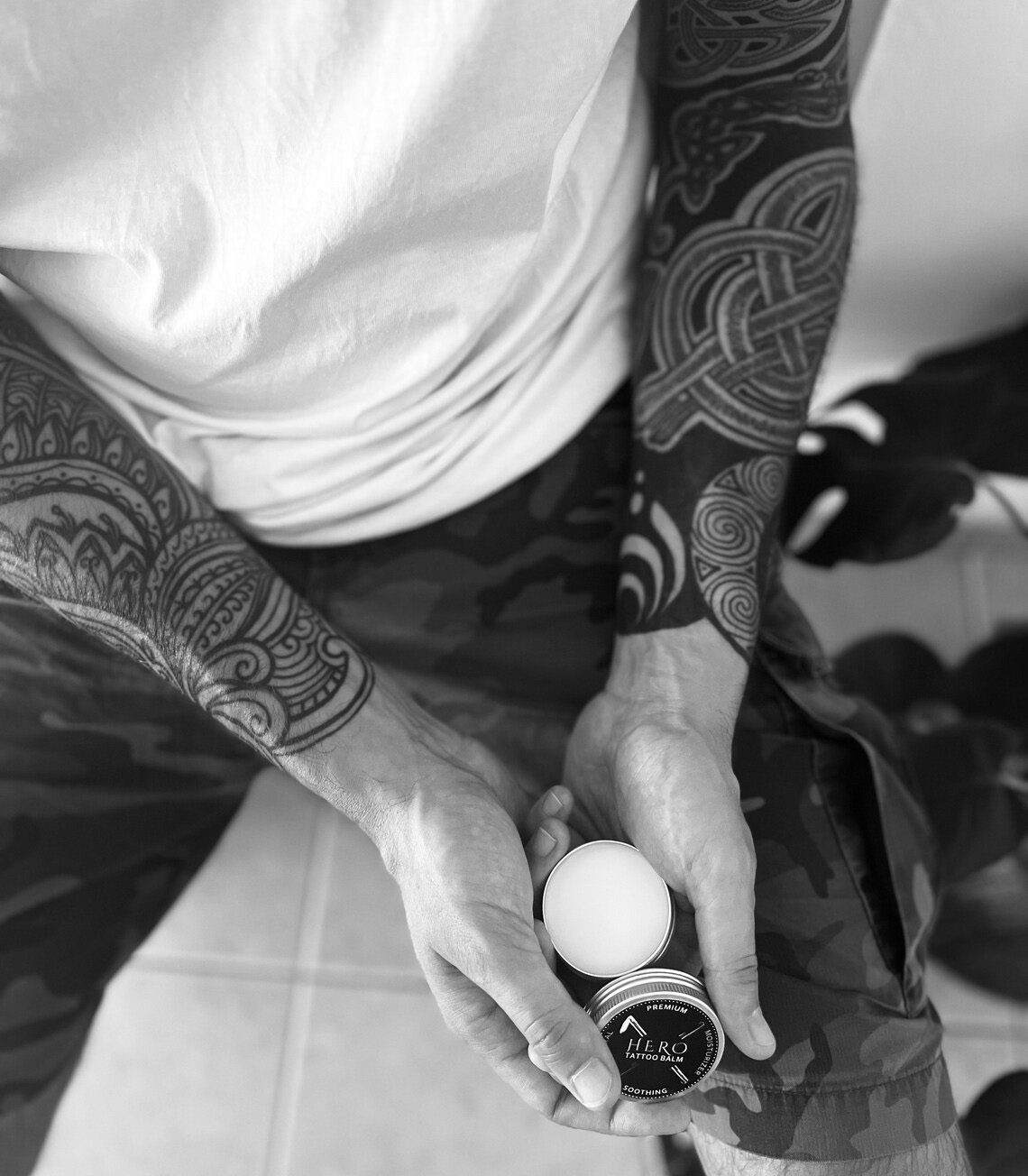 Hero Tattoo Balm started as a personal solution. I created it for myself, tested it on my own tattoos, refined it, and kept improving it until it worked the way I wanted: soothing, effective, non-greasy, and built for real tattooed skin.